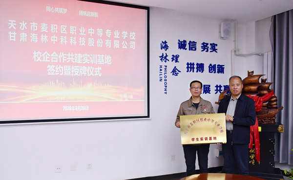 3月26日,天水市麦积区职业中等专业学校与海林公司校企合作共建实训基地签约暨授牌仪式在公司2号会议室举行。麦积区职业中等专业学校校长李顺田一行到访交流,公司监事会主席、工会主席刘兴民等陪同。
